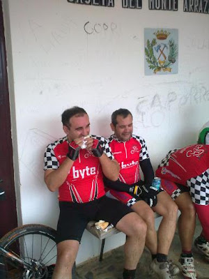 Arriba aunque se nos vea tumbados, no quiere decir que estemos cansados (que lo estamos y mucho, jejeje), a parte de eso es que el asfalto estaba tan caliente que con los 0º C que había arriba daba gusto estar tendidos. Paco también tuvo su minuto de gloria, ya que subió con el coche y cogiendo la bici de Mario bajó unos metros para hacer una entrada triunfal esprintando a 6 Km/h conmigo,(que me ganó por que metió la cabeza como los mejores).Bajada espectacular y llegada a Bejar para coger agua de nuevo. Subimos Cantaelgallo, que por poco la “liamos parda” metiéndonos en la autovía y seguimos hasta Baños de Montemayor para así llegar de nuevo a Hervás .
